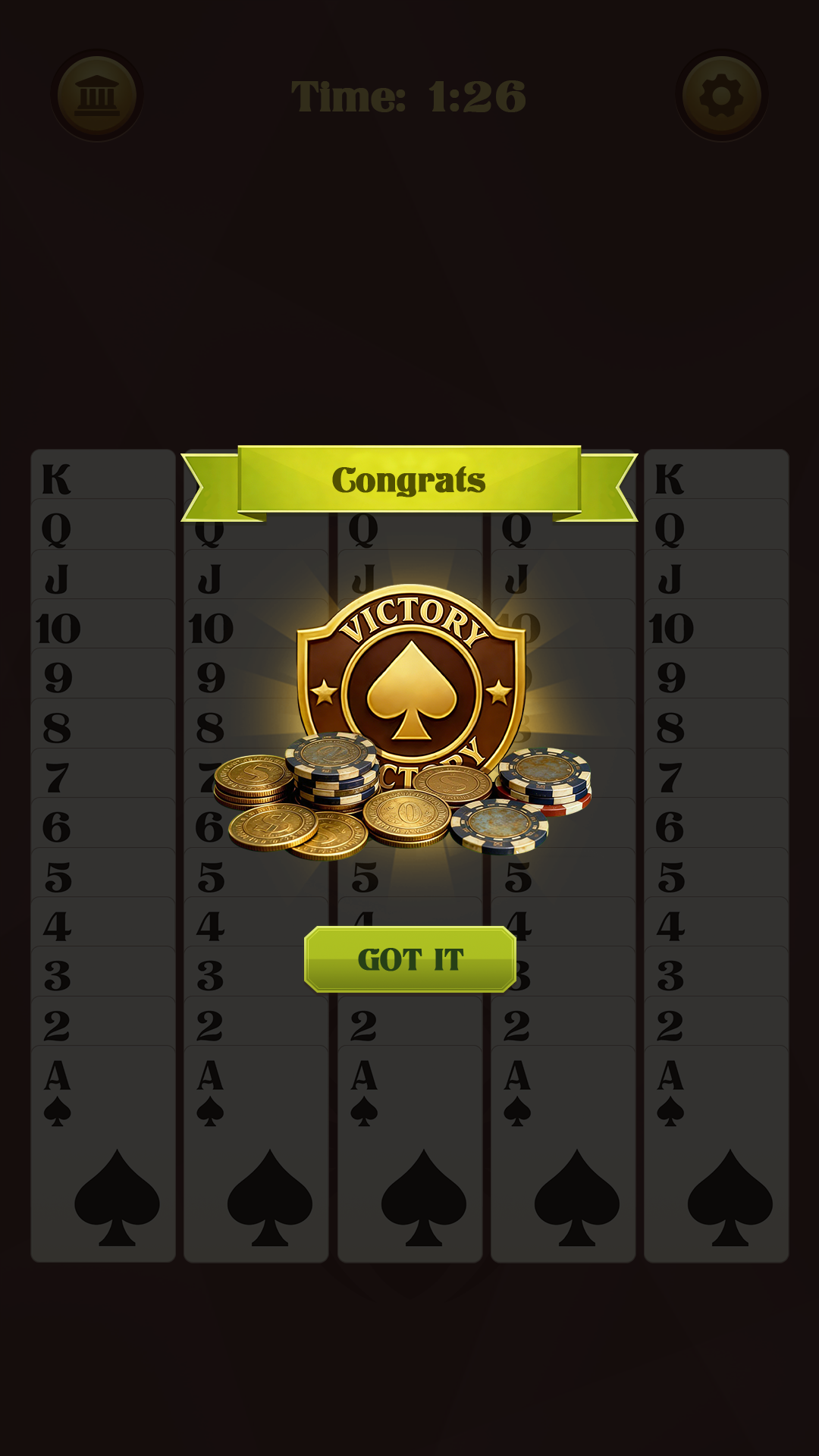 Complete five full King-to-Ace sequences to win the game. A straightforward objective keeps the focus on strategy, precision, and satisfying progression.